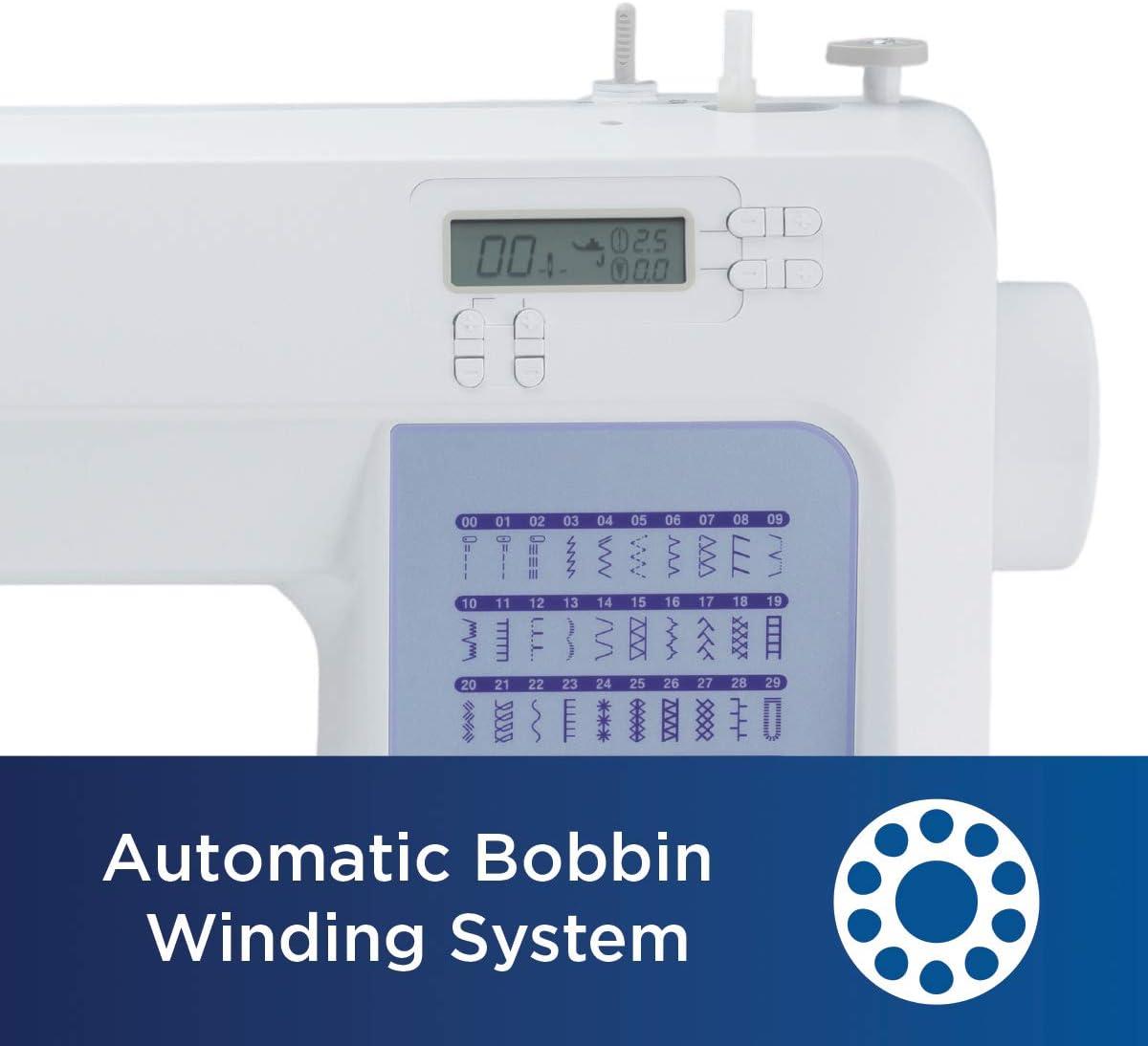 IMPROVED NEEDLE THREADER: Easier than ever to use, the automatic needle threader reliably pushes the thread through the needle. The convenient, jam resistant drop-in top bobbin easy to load and helps ensure your bobbin stays in place