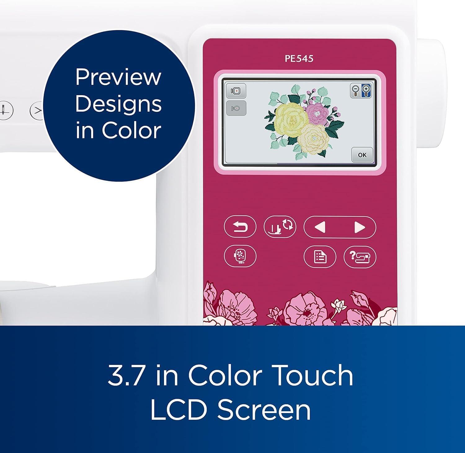 Brother PE545 Embroidery Machine, Wireless LAN Connected, 135 Built-in Designs, 4″ x 4″ Hoop Area, Large 3.7″ LCD Touchscreen, USB Port, 10 Font Styles(PE545 + Feet & Thread)